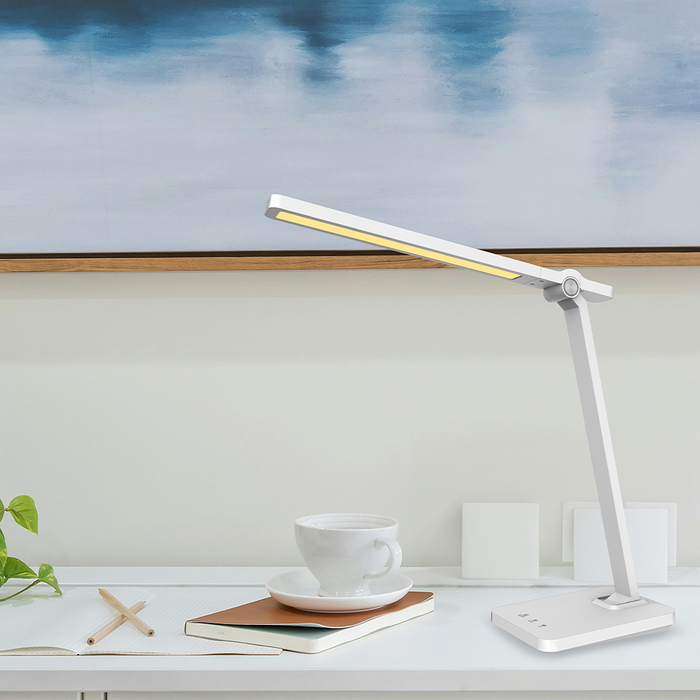 The desk lamp also features an integrated 10w LED light source with Tri-Colour technology allowing you to select a desired light colour from warm white to day light (3000K/4000K/6000K).