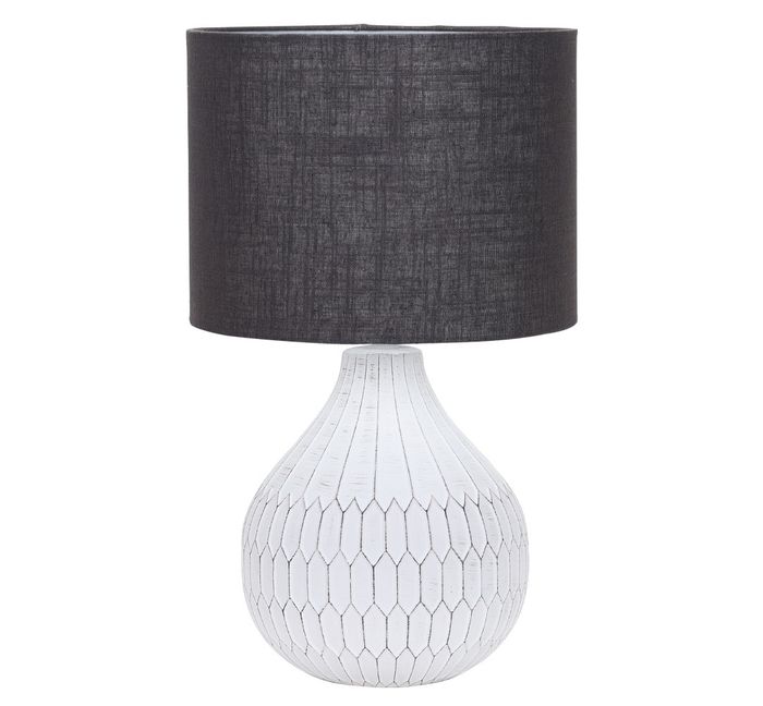 The Klay table lamp has a base that has a textured surface that resembles a honeycomb pattern. The shade is cylindrical and has a simple, understated design. The lamp is a beautiful and elegant piece that would add a touch of sophistication to any room.