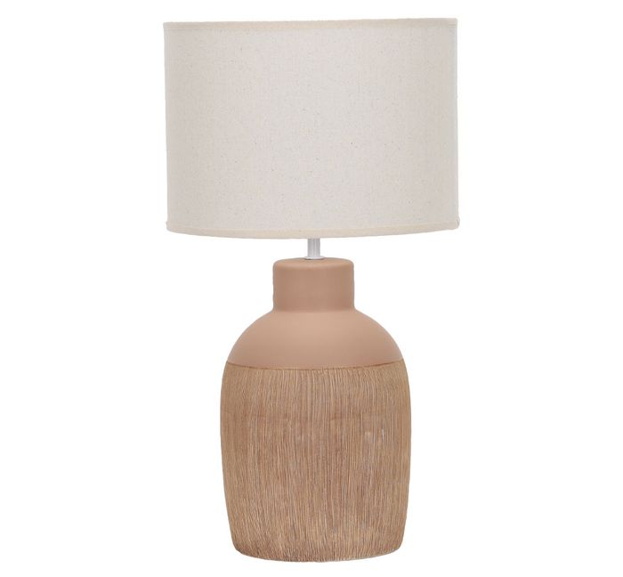 The Mona table lamp base is textured with fine lines, resembling woven fibers, giving it a natural and rustic aesthetic. The lamp shade is simple and cylindrical, adding a touch of classic elegance. The lamp would be a perfect addition to a living room, bedroom, or study, providing soft, warm light. The neutral colors make it versatile and easy to incorporate into any décor style.