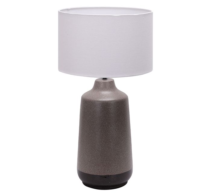 The new Venus table lamp presents with a grey ceramic base and a white fabric shade. The base has a textured finish. The shade is drum style and has a classic design. The lamp is a good choice for a living room, bedroom, or study. It would add a touch of sophistication and elegance to any room.