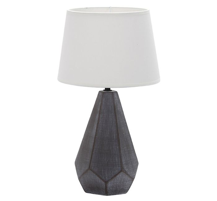 This new and improved modern table lamp  presents with a geometric base and a white drum shade. The base is a dark gray color and has a textured finish that gives it a rustic look. The shade is a simple white, allowing the base to be the focal point of the lamp. The lamp is perfect for adding a touch of contemporary style to any room.